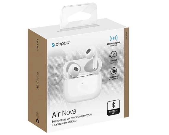 Bluetooth стереогарнитура Deppa Air Nova,TWS, BT 5.1, 300 мАч, QI, белая в Омске